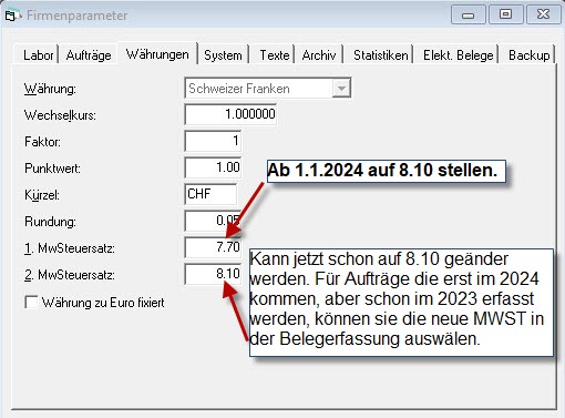Neuer MWST Satz 202412.12.2023Allgemein Unter Firmenparameter – Währungen, kann man die neue MWST anpassen (siehe Bild) Vorheriger Beitrag Neue MegaDent Version 6.3.7 Nächster Beitrag MegaDent Update 6.3.22